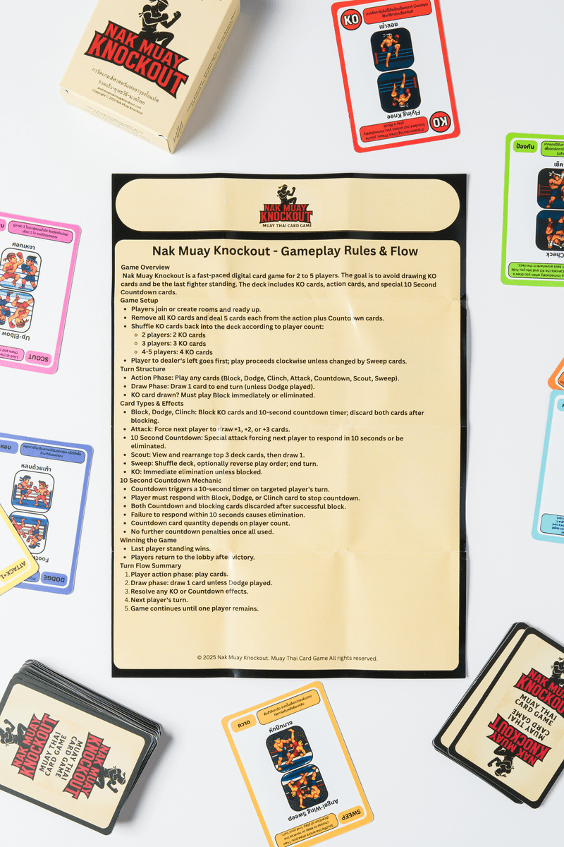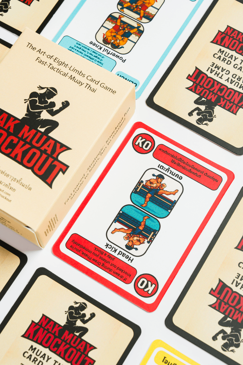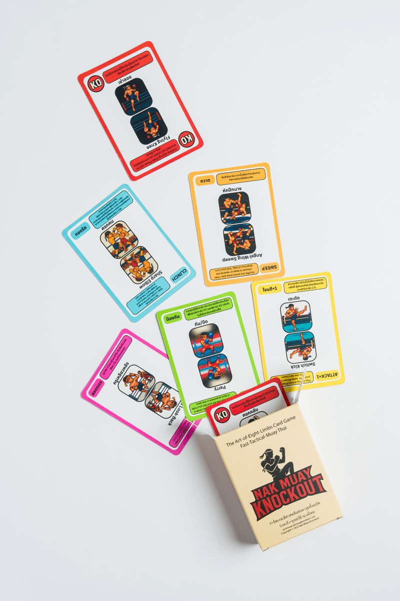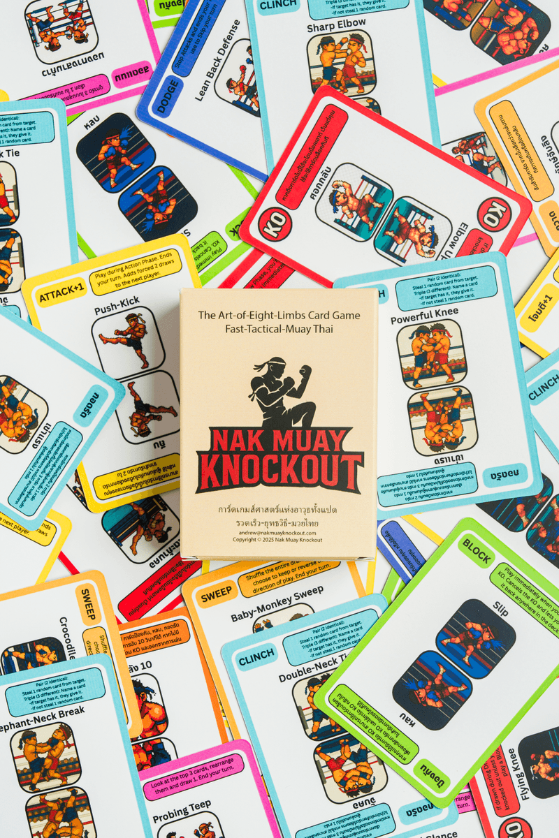 Step into the ring with the world's first Muay Thai themed card game! Test your timing, tactics, and survival skills in Nak Muay Knockout, a fast-paced 'Art of Eight Limbs' battle where every draw could be your last. Use Attacks, Blocks, Dodges, Clinches, Scouts, and Sweeps to outlast your opponents but beware of the KO cards lurking in the deck! Last fighter standing wins ๐ฅ